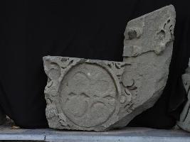 It is an architectural fragment of some building. A circle is carved on the front with designs in it. Area around the circle is also carved with many different designs.
