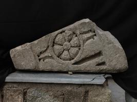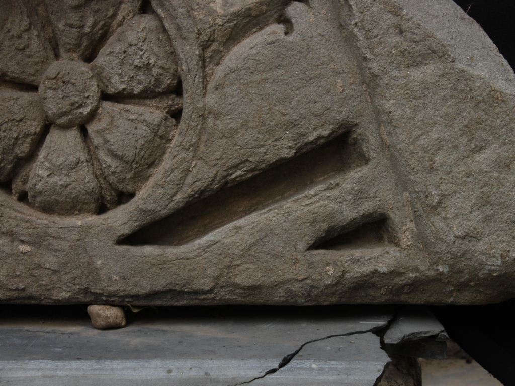 It is an architectural member of some building. A flower is carved in a circle in the center and some deep lines are carved around it.