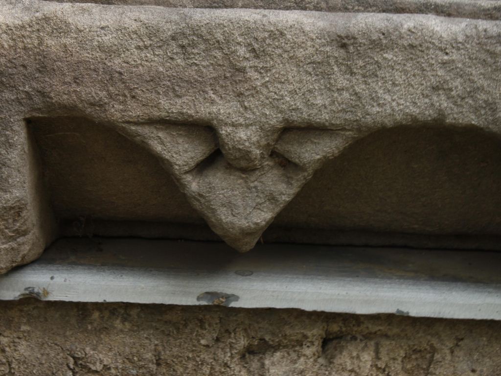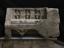 It is an architectural member made of stone. A beautiful floral panel is carved on the front in the middle and all flowers are in separate niches. There is also some carving between the flowers.