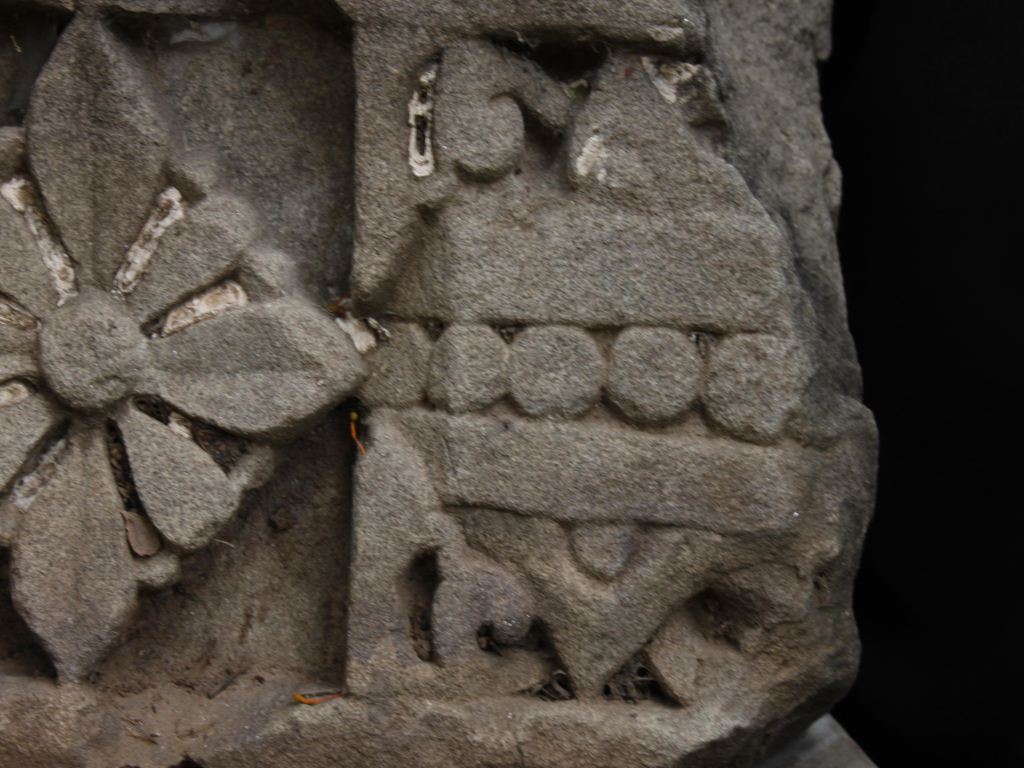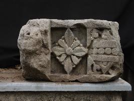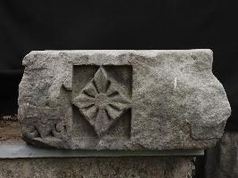 It is an architectural panel made of stone. In the front and left middle portion a flower is carved beautifully in deep section. On left side some intricate designs are also carved beautifully right side of the flower.