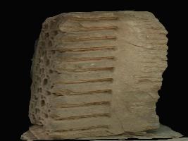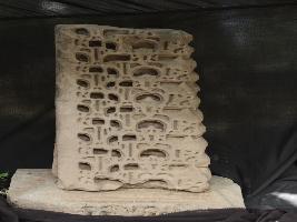 It is a broken part of shikhara made of stone. Shikhara is the top portion of any temple. Front portion is carved with intricate designs but in manner. Steps are carved on the left side vertically.