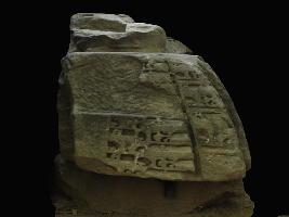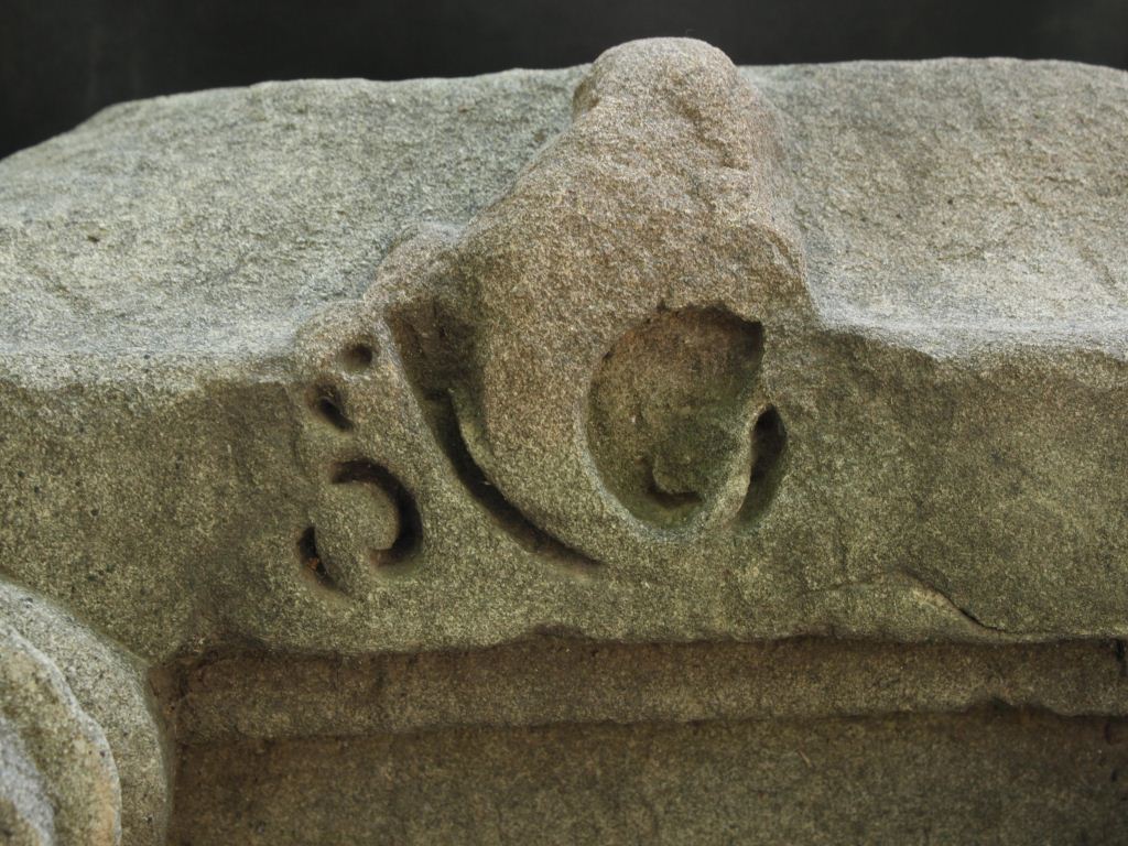 It is a broken part of shikhara made of stone. Shikhara is the top portion of any temple. Front portion and right side is carved with intricate designs but in manner. Upper left front portion is also carved with deep incised lines.