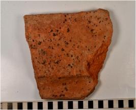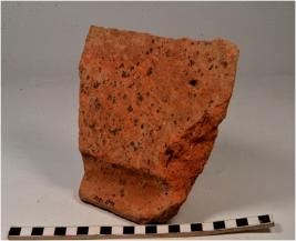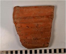 | Description / विवरण | A fragment of a terracotta tile having grooves on surface of rough surface. |