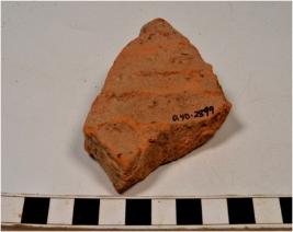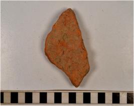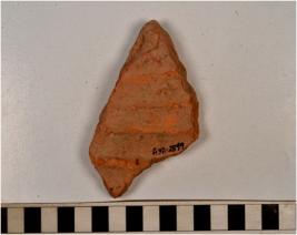 | Description / विवरण | A fragment of a terracotta tile showing grooves on rough surface. |