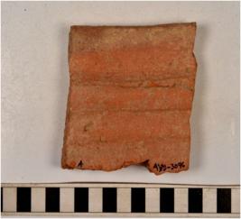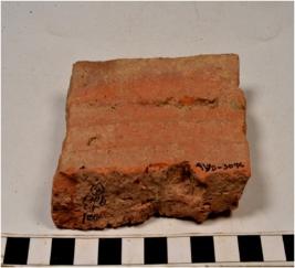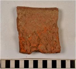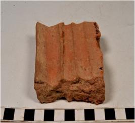| Description / विवरण | A fragment of a terracotta tile having deep finger impression rough surface of medium fabric. |
