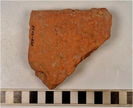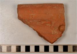 | Description / विवरण | A fragment of a terracotta tile with grooves on exterior surface of rough surface. |