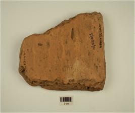 | Description / विवरण | Fragment of a tile of red ware with cut marks on the edge. |