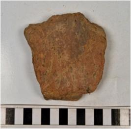 | Description / विवरण | A fragment of a terracotta tile having incised check design on exterior of coarse fabric. |