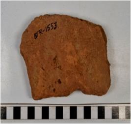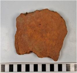 | Description / विवरण | A fragment of a terracotta tile of coarse fabric and smooth surface from one side. |