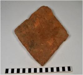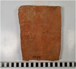 | Description / विवरण | A fragment of a terracotta tile of coarse fabric and smooth surface from one side. |