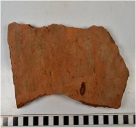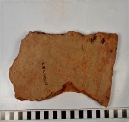 | Description / विवरण | A fragment of a terracotta tile of coarse fabric and rough surface. |