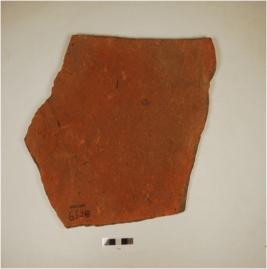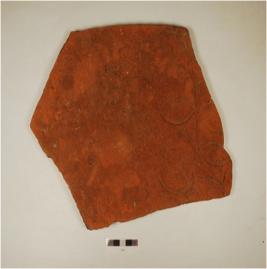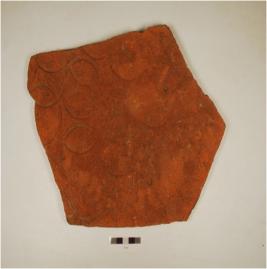 | Description / विवरण | Fragment of Terracotta tile, decorated with intersecting circles on exterior by wooden stamp, medium fabric and grey core. |
