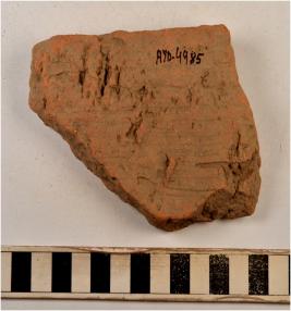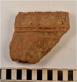 | Description / विवरण | A fragment of a terracotta decorative tile with ractangular shape showing wheel design on surface having smooth surface. |