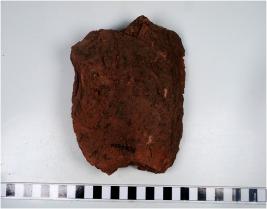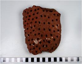 | Description / विवरण | A fragment of a terracotta tile having multiple semi holes on one side rough surface. |