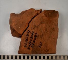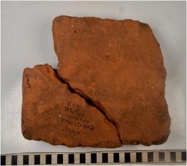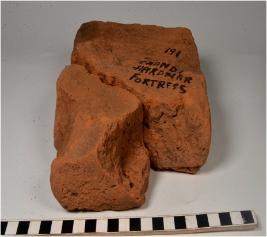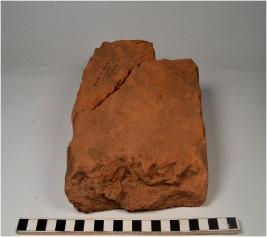| Description / विवरण | A fragment of a terracotta mended brick of rough surface. |