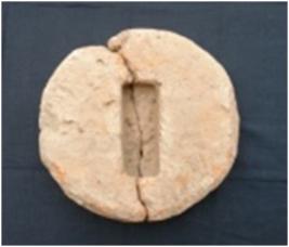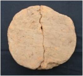 | Description / विवरण | It is a spherical or circular object broken into almost two equal halves which have been subsequently mended. At the centre a rectangular depressed hole is found. There is a big cutting mark on the hole which is the object is divided in to 2 piece. |