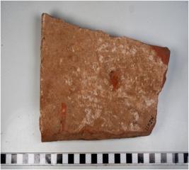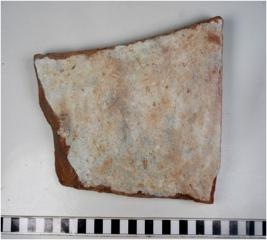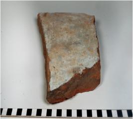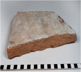 | Description / विवरण | A fragment of a terracotta tile having light green colour on coating surface of thick section. |