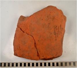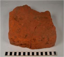 | Description / विवरण | A fragment of a mended terracotta brick of rough surface. |