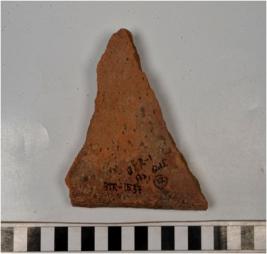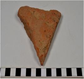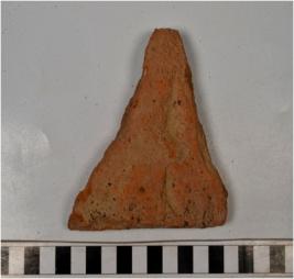 | Description / विवरण | A fragment of a terracotta tile of rough surface and coarse fabric. |