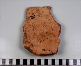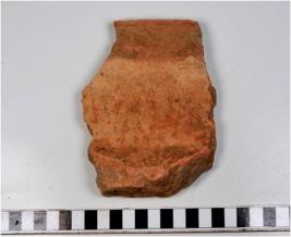 | Description / विवरण | A fragment of a terracotta drain type object with flat depression in the center with raised edges one side, flat from other sides of thick fabric rough surface. |