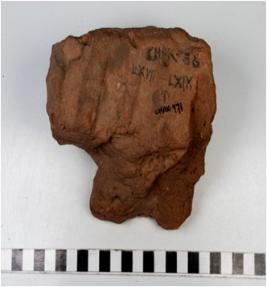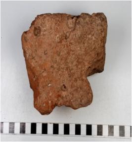 | Description / विवरण | A fragment of a terracotta brick of red ware having finger impression on side and sturdy texture. |