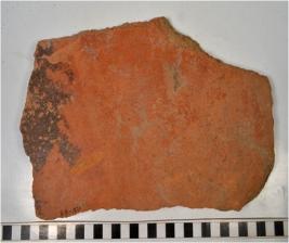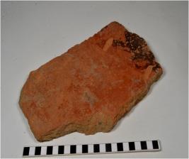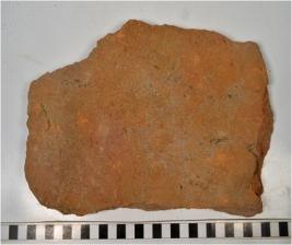 | Description / विवरण | A fragment of a terracotta tile rough surface and coarse fabric. |