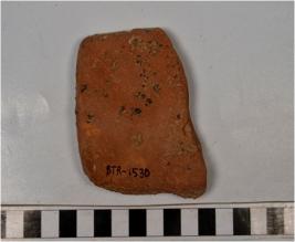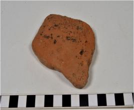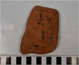 | Description / विवरण | A fragment of a terracotta tile of rough surface and coarse fabric. |