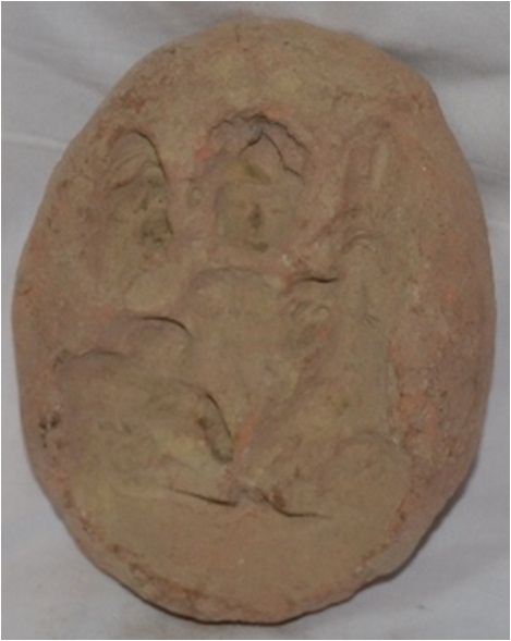 Terracotta Brick in oval shape. On one of its faces, hollow forms are carved out. It is to be made use of it as a dice in making relief stamps in terracotta. Its edges have been rounded off. The colour of the brick is Indian red.