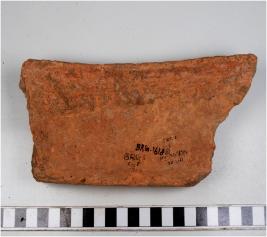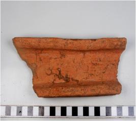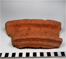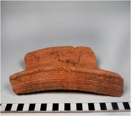 | Description / विवरण | A fragment of a terracotta drain type object having depression at the centre of thick fabric sturdy texture. |