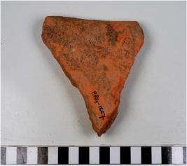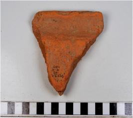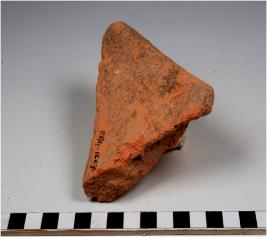 | Description / विवरण | A fragment of a terracotta tile having depression on rough surface of medium fabric. |