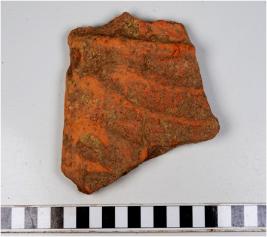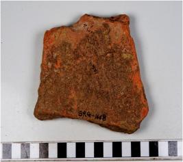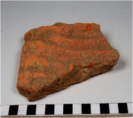 | Description / विवरण | A fragment of a terracotta tile having finger impression rough surface of medium fabric. |