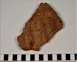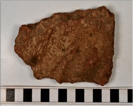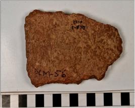 | Description / विवरण | A fragment of a handmade terracotta tile having finger impression of coarse fabric rough surface. |