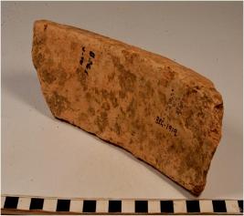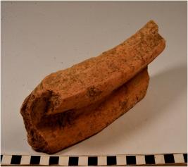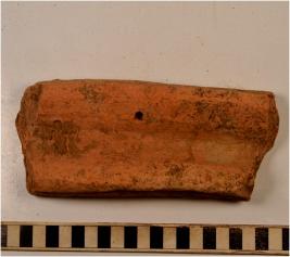 | Description / विवरण | A fragment of a terracotta drain type object having depression with raised sides at the centre, thick fabric, rough surface. |