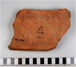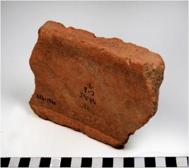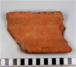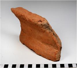 | Description / विवरण | A fragment of a terracotta drain having depression at the centre rough surface and medium fabric. |