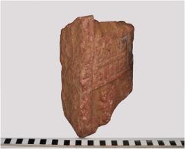 | Description / विवरण | A fragment of a dwar sakha Pillar of red sand stone showing chaitya gwakch, decorative design and male deity wear, decorative crown, open eyes, slightly broken nose, smiling lips, elongated face. |