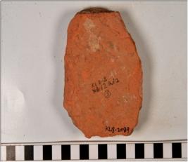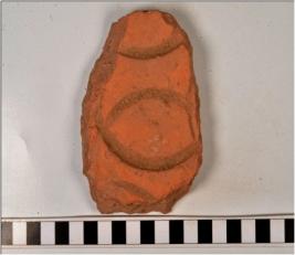 | Description / विवरण | A fragment of a terracotta tile with showing deep incised oval shaped design on interior surface of coarse fabric. |