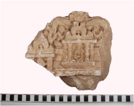 | Description / विवरण | A structural fragment of a pillar showing fully decorated carving, two attendant praying both side on chaitya gwaksha, main deity seated in chaitya vihara. |