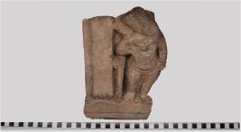| Description / विवरण | The sculpture fragment depicting standing ganesha with eroded facial features, long trunk, tusk, fan like shape ears, his left hand resting on waist and right hand elbow is resting on parasu and hand aslo holds a belly, he wears ankle length dhoti tied to waist band with over hanging bead strings he is adorned with armlets, beaded yajnopavita, head band and girdle. |