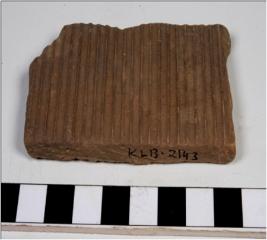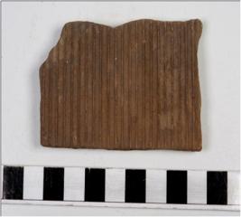 | Description / विवरण | A fragment of a terracotta till, with incised horizontal lines on the surface. |