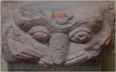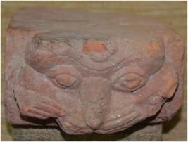 Terra cotta Brick. On the smaller face it shows the face of lion in relief. The moustaches are in the form of incised lines. The mouth is made under the form, which is not visible from the front. The eyes are protruding. The colour of the brick is Indian red.