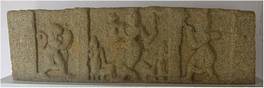 | Description / विवरण | A wall panel depicting a four armed Venugopala flanked on either side by a standing female figure and a cow. To the right and left of the God in separate panels is the figure of Hanuman and Garuda respectively making adoration to the God. |