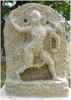 | Description / विवरण | A granite slab representing a standing Hanuman facing to left with the right hand raised upwards behind and the left hand holding a bunch of flowers. The tail goes up over the head. Part of mouth is chipped off. |