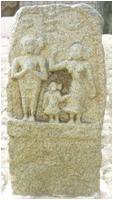| Description / विवरण | A memorial stone depecting a hero standing in samabhanga pose with hands held in anjali pose. To his left is the sati standing with her right hand raised. In the centre of the couple is a small aldy standing on the upper panel is a Shiva linga with sun. |