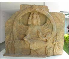 | Description / विवरण | An indeterminate stone slab possibly a wall pannel depicting 'Karthikeya' or 'Shanmuka' seated on his vehicle peacock in a nich shaped like a chaitya window flanked on either side by a female chari bearer. The front two hands of the God the chest, three faces are shown in front as round shape the remaining three are depicted as behaind in imagintery concept. |