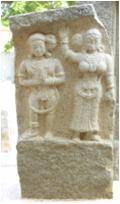 | Description / विवरण | A granite memorial stone depicting the hero standing in an attitude of adoration. By the side of the hero is the Sati who stands with her right hand raised above to the elbow. The drapery and ornaments of the figures are very eleborately carved. |