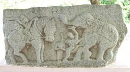 | Description / विवरण | Fragment of an indeterminate slab, possibly a wall panel depicting a male figure, attempting to control a tamed tusker elephant holding one of the tusk of the latter in his left hand and piercing the animal with the goad in the right hand. Through left leg kiked the elephant. |