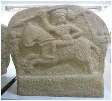 | Description / विवरण | A memorial stone representing a male warrior sitting over a galopping horse possibly fighting. The hero holds in his uplifted right hand a long spear. Behind the horse is a male figure holding an umbrella on the head of the hero. At the extreme right of the panel a female figure posibly the wife of the warrior is depicting. |