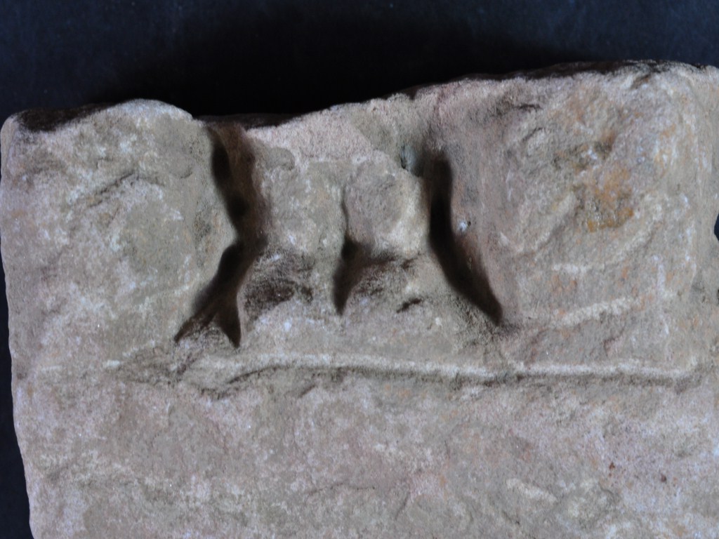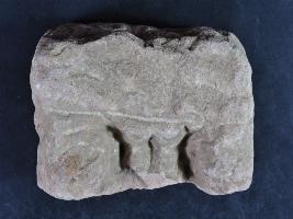 It s a stone sculpture. It is damaged from all sides and its colour is brownish. It is well decorated and human legs on it. Its bottom portion is flat and legs are broken. Many irregular marks on the surface. Rubbing on the surface and deposition of dust. Surface is rough and flaking on it.