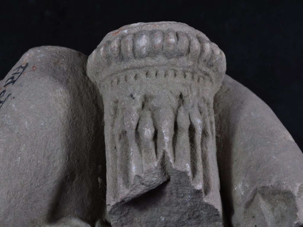 It s a piece of pillar made of stone, Colour is brownish. Pillar design, some design on it and all sides are broken. Deposition of dust and dirt. Rubbing on the surface and flaking on it.