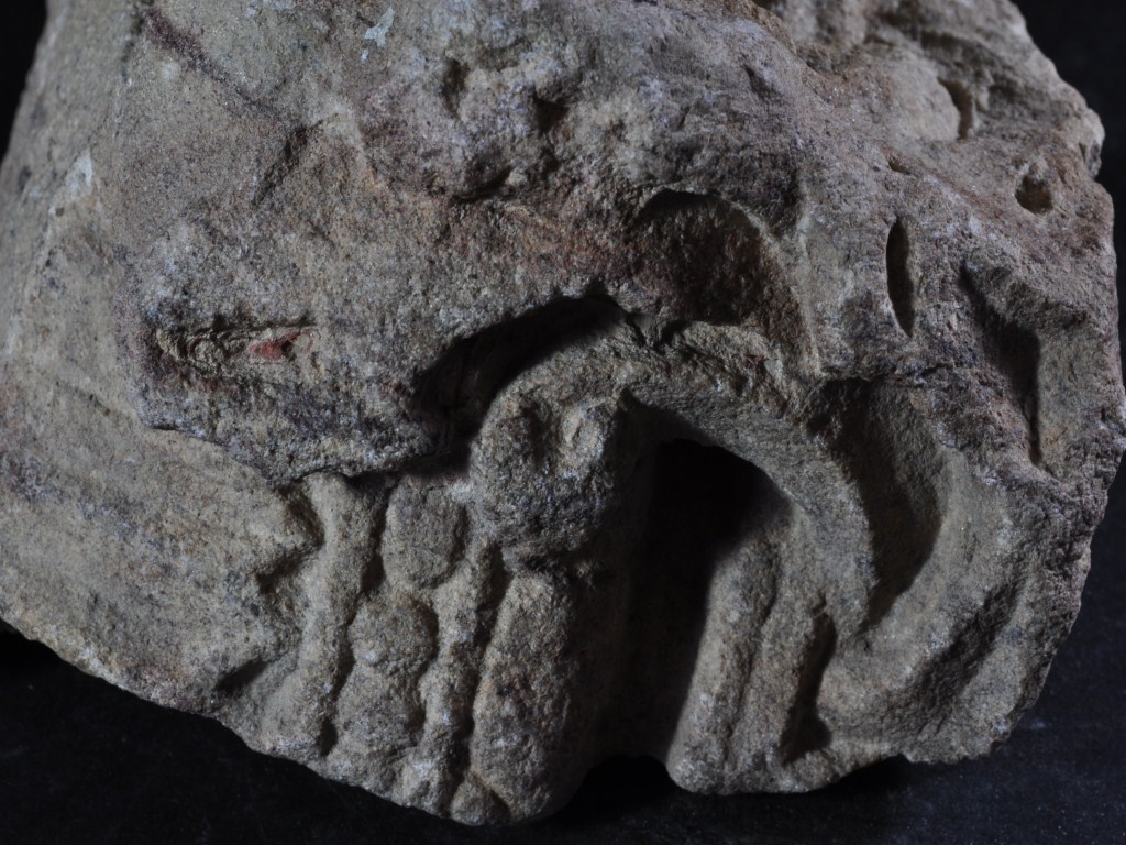 It s a piece of pillar made of stone, Colour is brownish. It s dotted design, deep lines, incise lines, leaf design on it and design is clearly visible. It s all sides are broken. Deposition of dust and dirt. Rubbing on the surface and flaking on it.